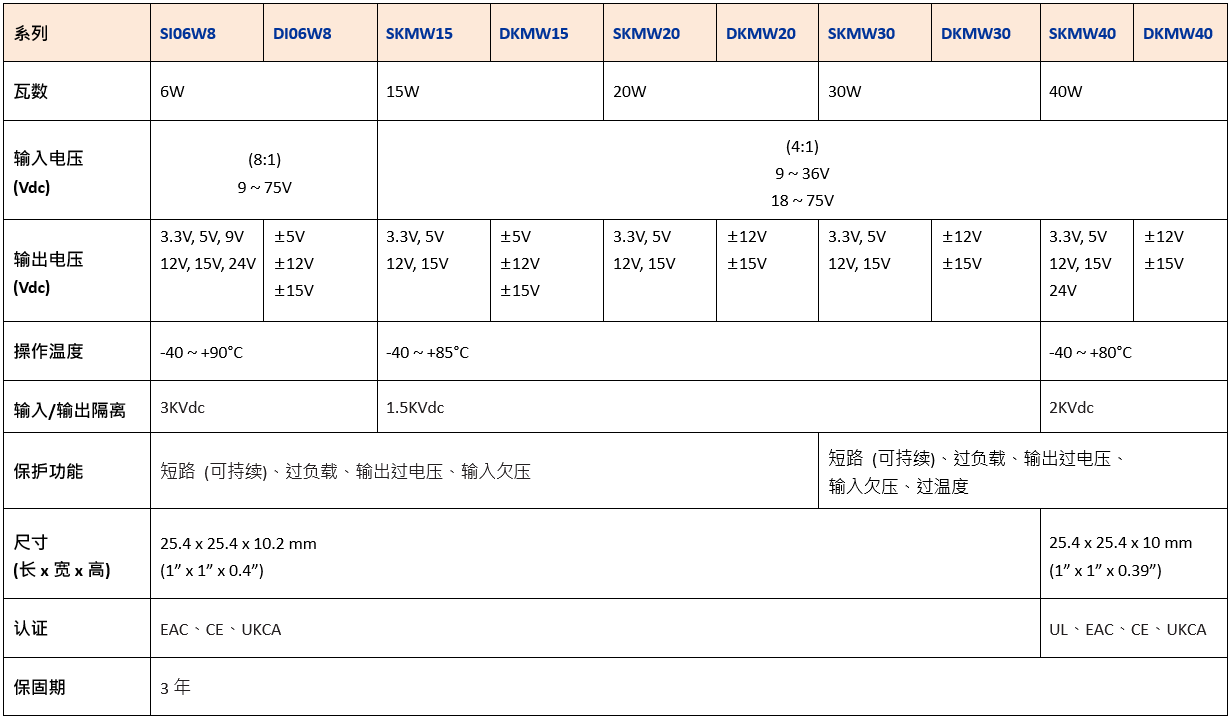 明緯繼推出 1" x 1" 6W/15W/20W/30W 寬壓輸入 DC-DC 轉(zhuǎn)換器后廣受好評(píng),為滿足 1" x 1" 更高瓦數(shù)的需求,新推出了 4:1 輸入 40W 的單組輸出 SKMW40 及雙組輸出 DKMW40 系列。