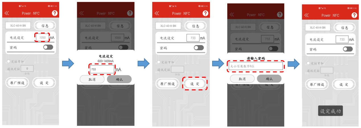 如下簡單說明如何透過 NFC 功能設定輸出電流: